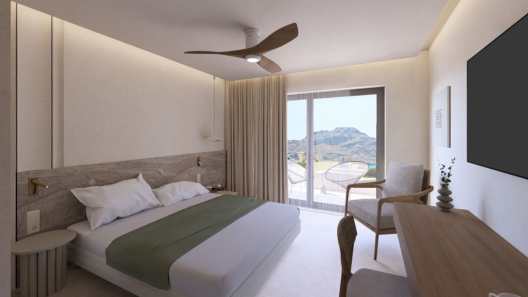 Each room includes a comfortable double bed, a sleek walk-in shower, and a private balcony or terrace furnished with a lounge chair — the perfect spot to enjoy the gentle sea breeze. A desk and chair provide added convenience for both work and relaxation.