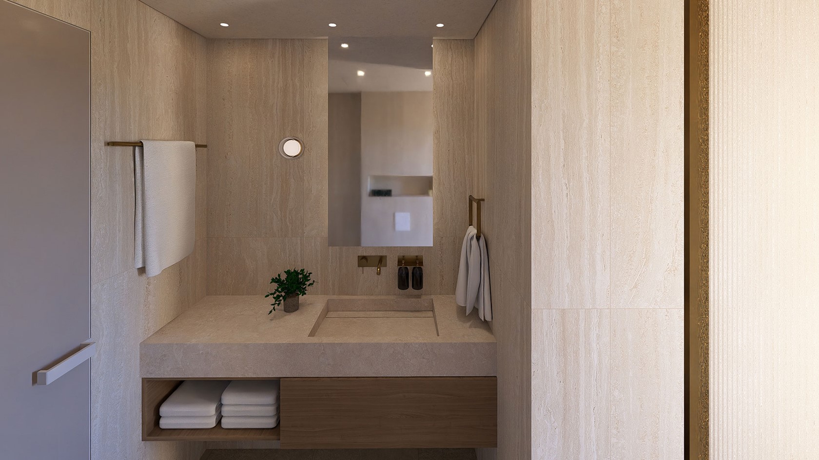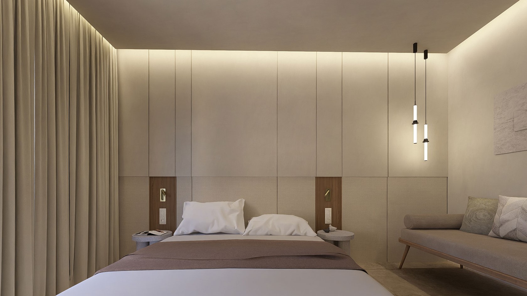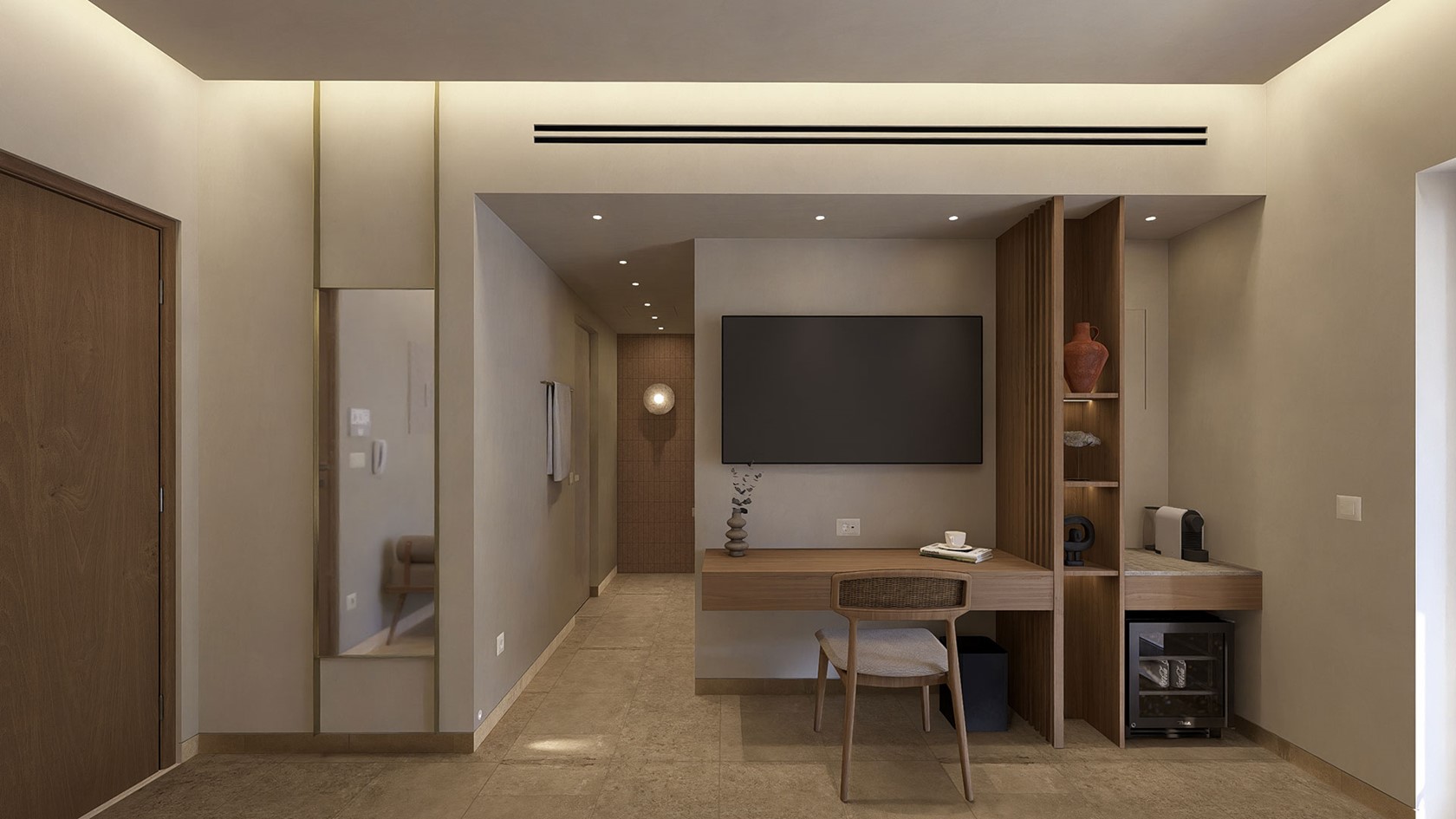 The suite features a separate bedroom with a premium double bed and a comfortable double sofa bed, ensuring both space and flexibility. A sleek walk-in shower, a cozy seating area, and a desk with chair add functionality and style, while the private balcony invites guests to unwind and enjoy the tranquil sea views.